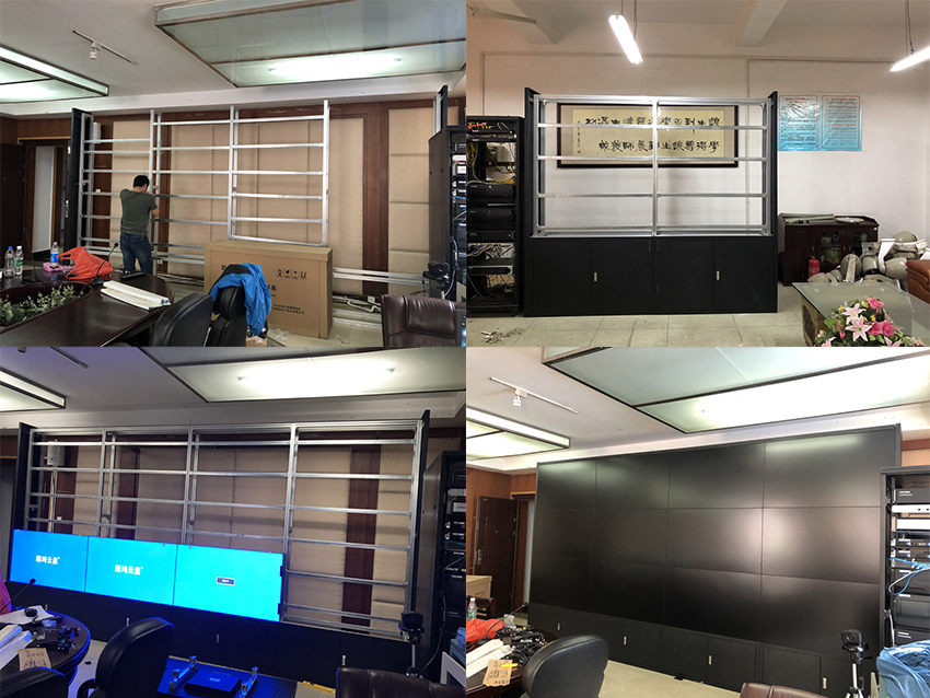 此次項目,采用信弘超窄邊3.5mm拼縫,總計24塊55寸液晶拼接屏,機(jī)柜安裝和落地支架安裝,打造了兩套拼接大屏。